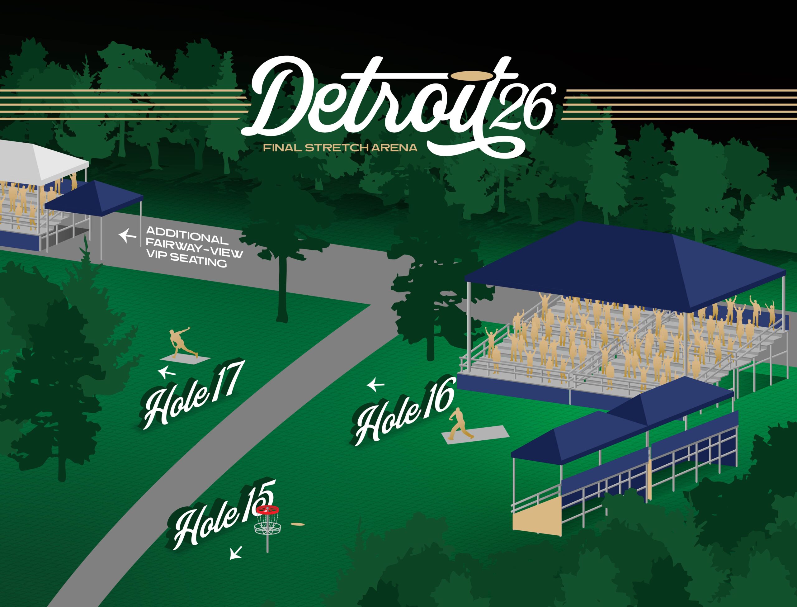 In addition, holes 15/16/17 will feature a massive raised platform viewing area capable of seating over 1,000 spectators—the largest ever constructed at a disc golf event.