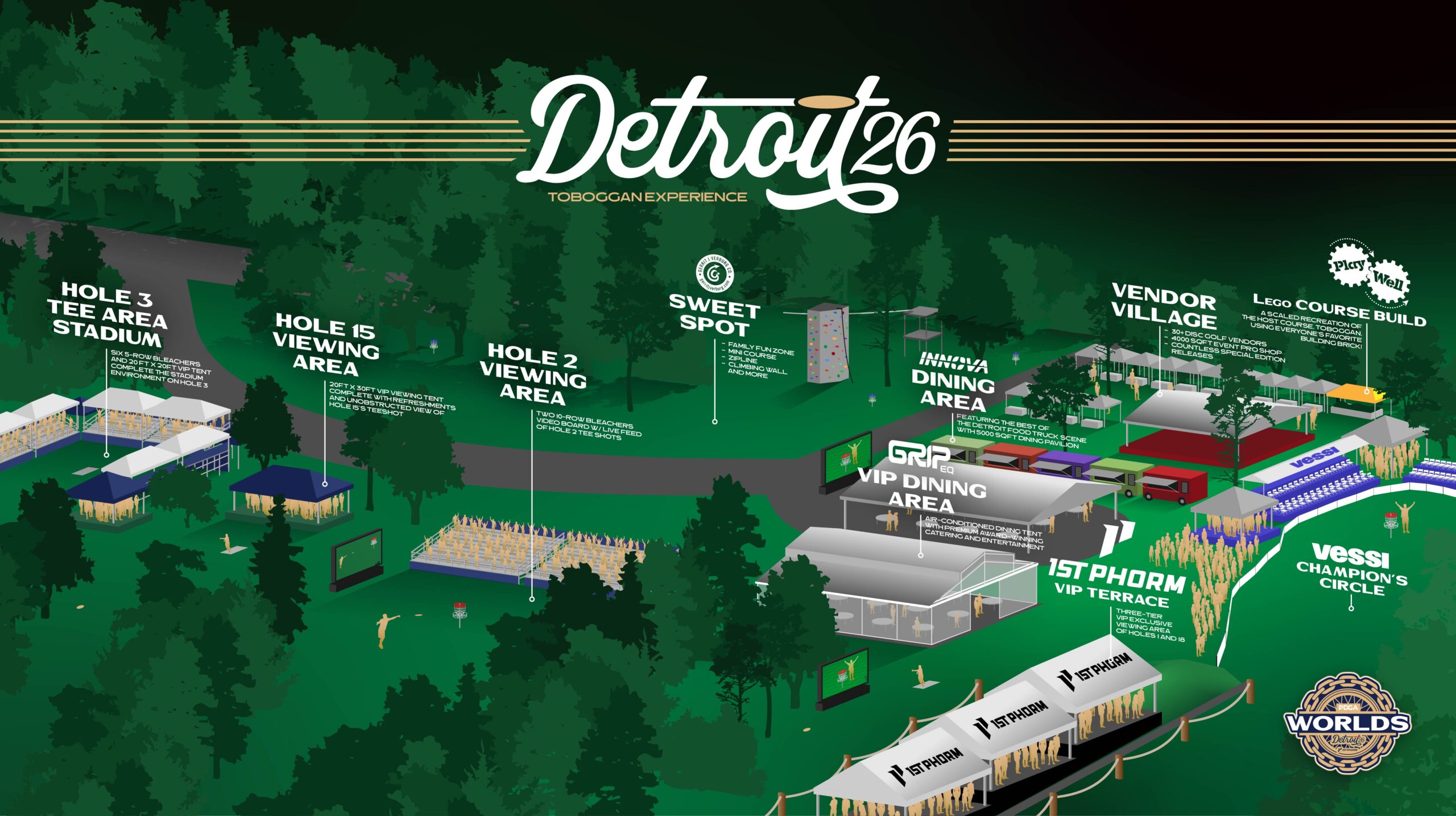 The 2026 PDGA World Championships promise to deliver the ultimate disc golf experience for spectators, blending world-class competition with an unmatched event atmosphere. The iconic Toboggan Course will serve as the heart of the event — a central hub where players, vendors, and fans come together to celebrate the sport. Spectators can look forward to premier viewing opportunities, including stadium-style seating on Hole 3 and the dramatic 18th green, where the next world champion will be crowned. Between holes 1 and 18, the 1st Phorm VIP Terrace will offer a multi-tiered view of the action, complemented by exclusive amenities and elevated comfort. The event will also feature the largest vending area ever assembled at a World Championship, ensuring plenty to explore off the fairways. Families can enjoy the Gerrit J. Verburg “Sweet Spot,” a vibrant mini course and family zone featuring attractions like a zipline and climbing wall. VIP guests will have access to Club K — a 3,000-square-foot, air-conditioned dining gallery offering catered meals, a cool retreat from the summer heat, and live broadcast coverage of the week’s thrilling play.
