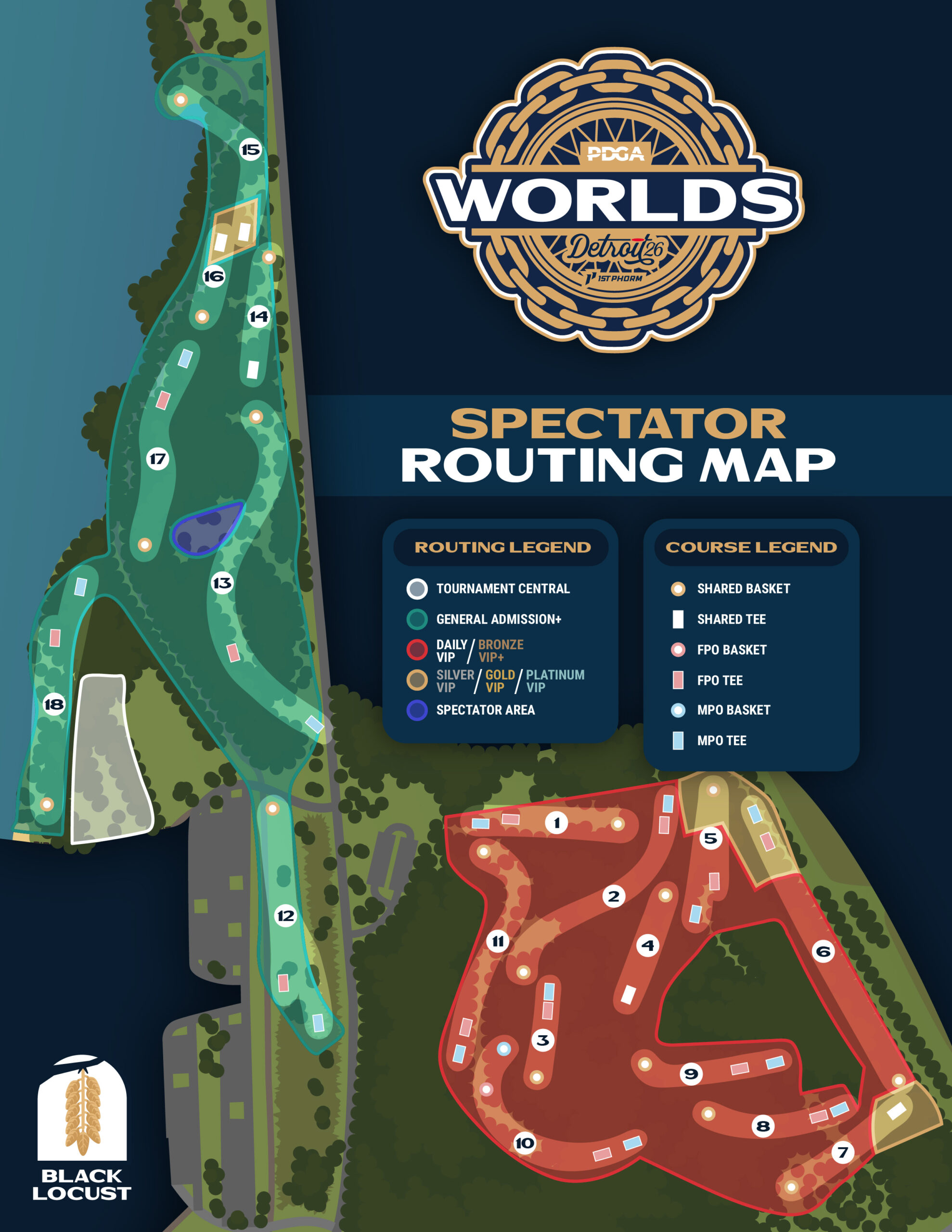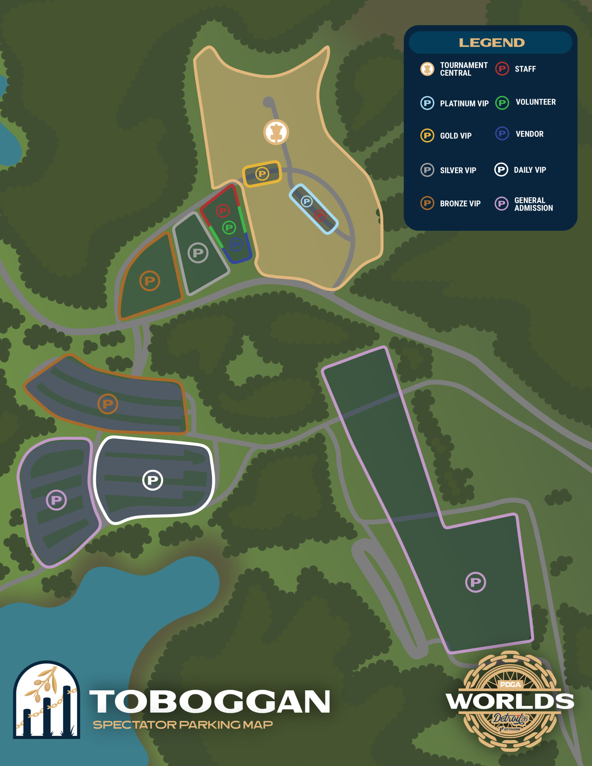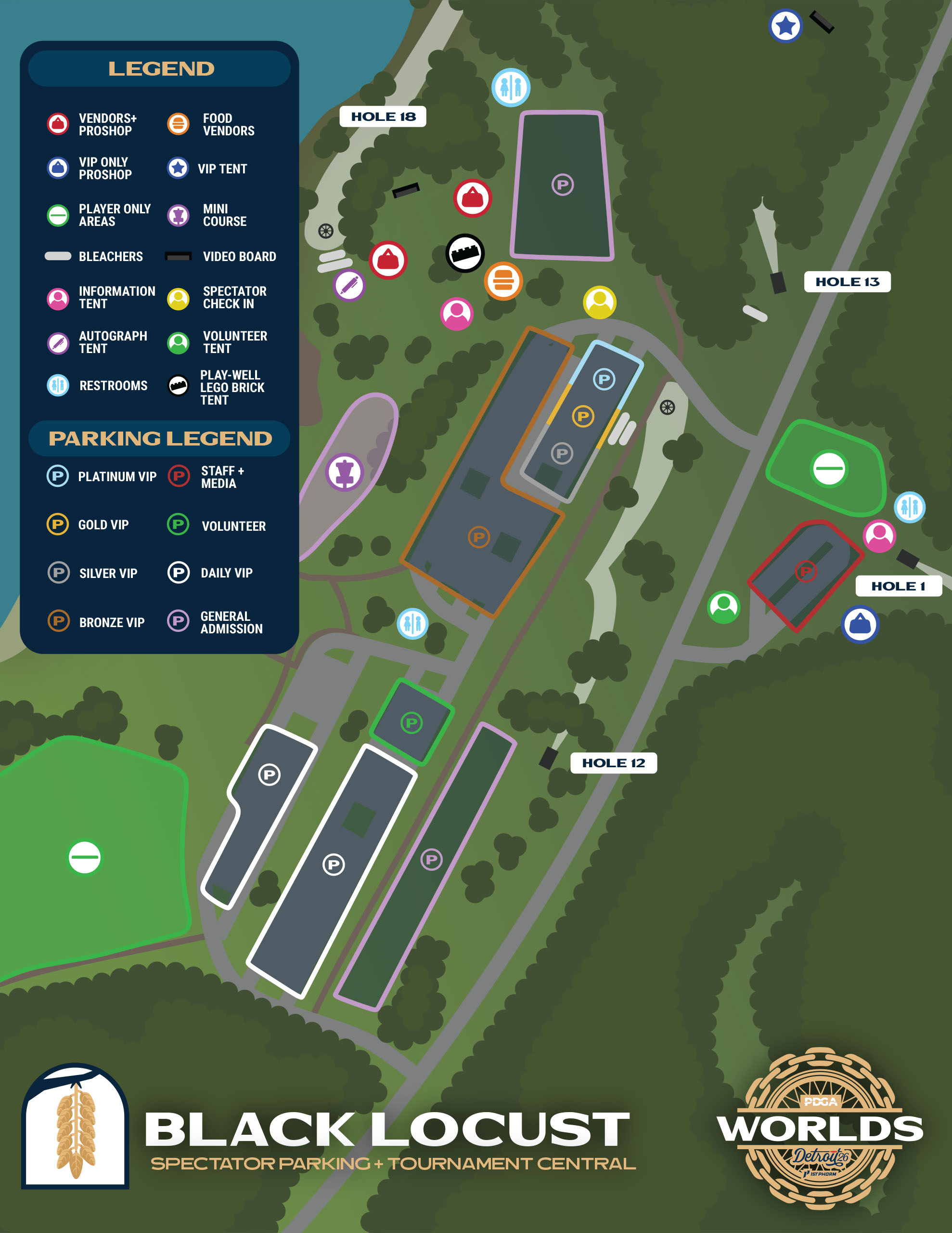 The 2026 PDGA Professional Disc Golf World Championships will take place across two championship-level courses, Toboggan and Black Locust, that are on the grounds of the Kensington Metropark. Both courses offer ample space for competition along with sizable vending areas, entertainment, dining, and parking. For a glimpse at the scale of next year’s event, take a look at the maps below.